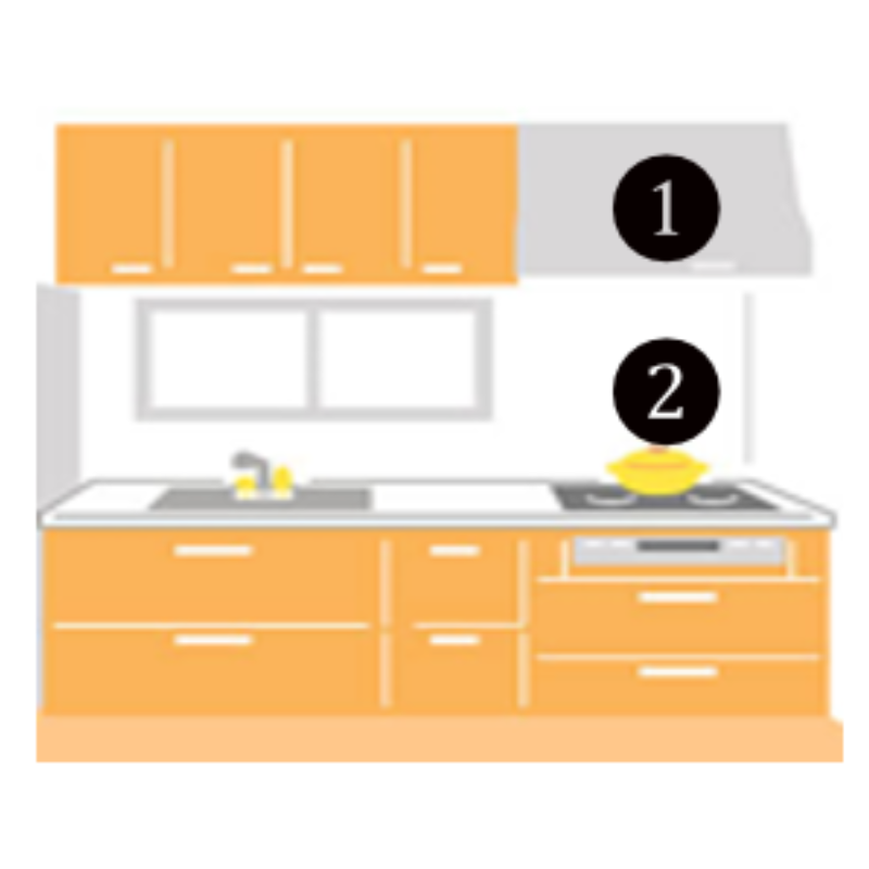 | ①レンジフード ②ガス台 部品の分解・洗浄・拭き上げ |